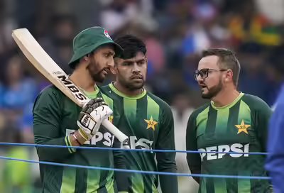 Pakistan’s captain Salman Agha (L), Usman Khan and coach Mike Hesson in Colombo. (PTI Photo)…
